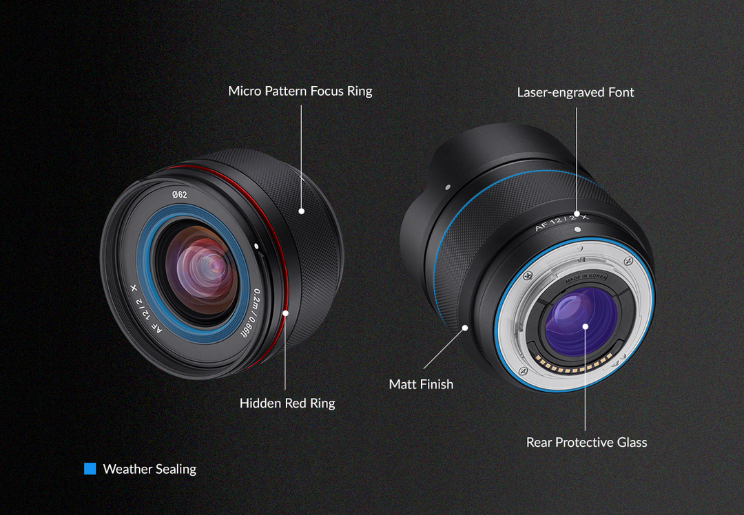 Utilizing the newest Linear Stepping Motor technology, the Samyang 12mm F2.0 AF lens combines a more compact design with improved auto-focus performance. By requiring the movement of only a single focusing group, it delivers especially fast, quiet, and precise focusing, whether shooting stills or videos. The design also allows for close focusing to 7.48” with no change in length or front element rotation.