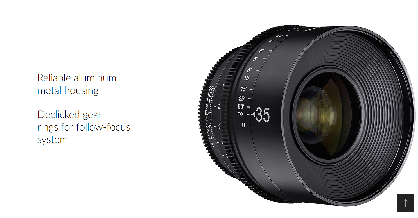 Samyang's XEEN 35mm T1.5 Lens is built specifically for use as a cinema lens. It features an internal focus design so that the lens does not change size while focusing, minimizing the appearance of breathing when changing focus. Each lens in the set is multi-coated for good contrast, glare prevention, and color match to a factory standard, allowing you to assemble a set over time with minimal color shift. This 35mm lens provides what is considered a somewhat wide angle of view on full-frame cameras, and a tighter angle of view on smaller formats.