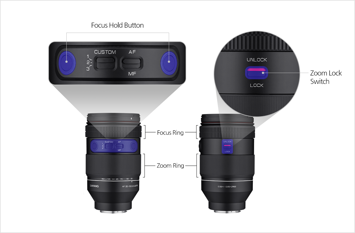 Since introducing the 2nd Generation lenses, Samyang has introduced the 'Hidden red ring' design that has become part of the brand’s design identity. The new design improves the look and usability of the lens, reflecting customer feedback, with enhanced tactile controls for focusing and precise focal length adjustment. A lock switch on the body helps users keep the lens set at its shortest 35mm position and is useful for protection during travel.