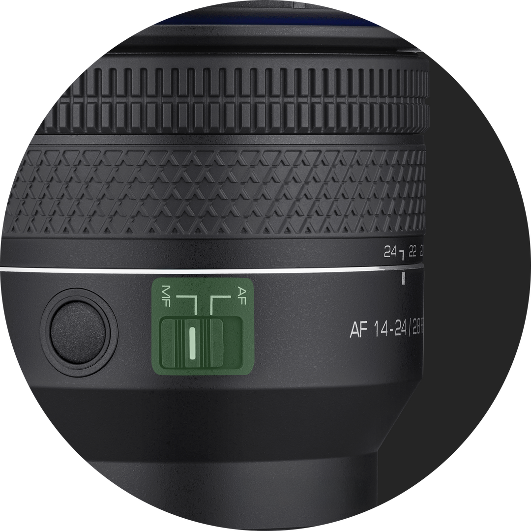 Enables smooth focal length adjustment from 14mm through 24mm, offering versatile framing from ultra-wide to standard wide-angle views.